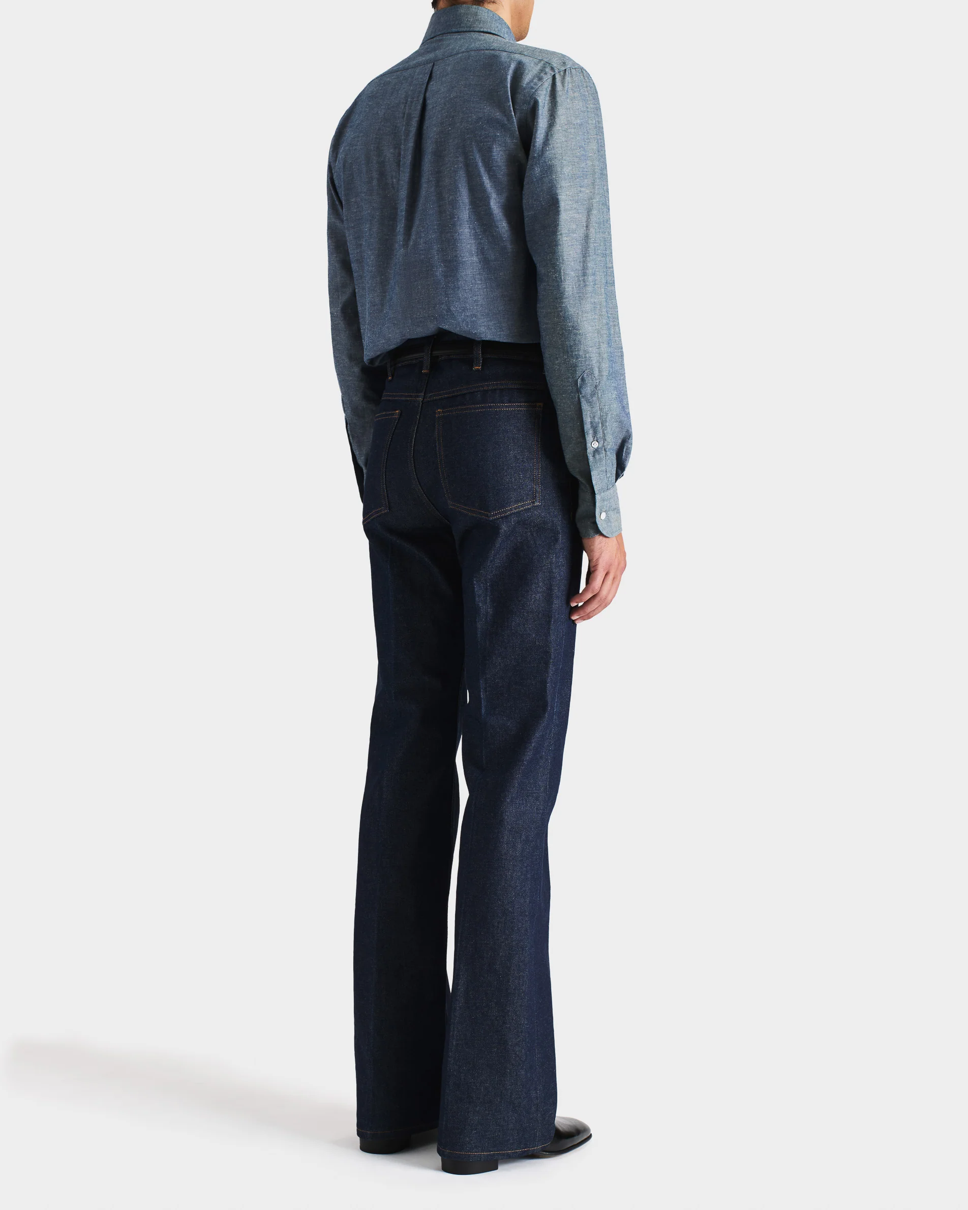 Chemise à col large, coupe classique, en chambray de coton et lin japonais.