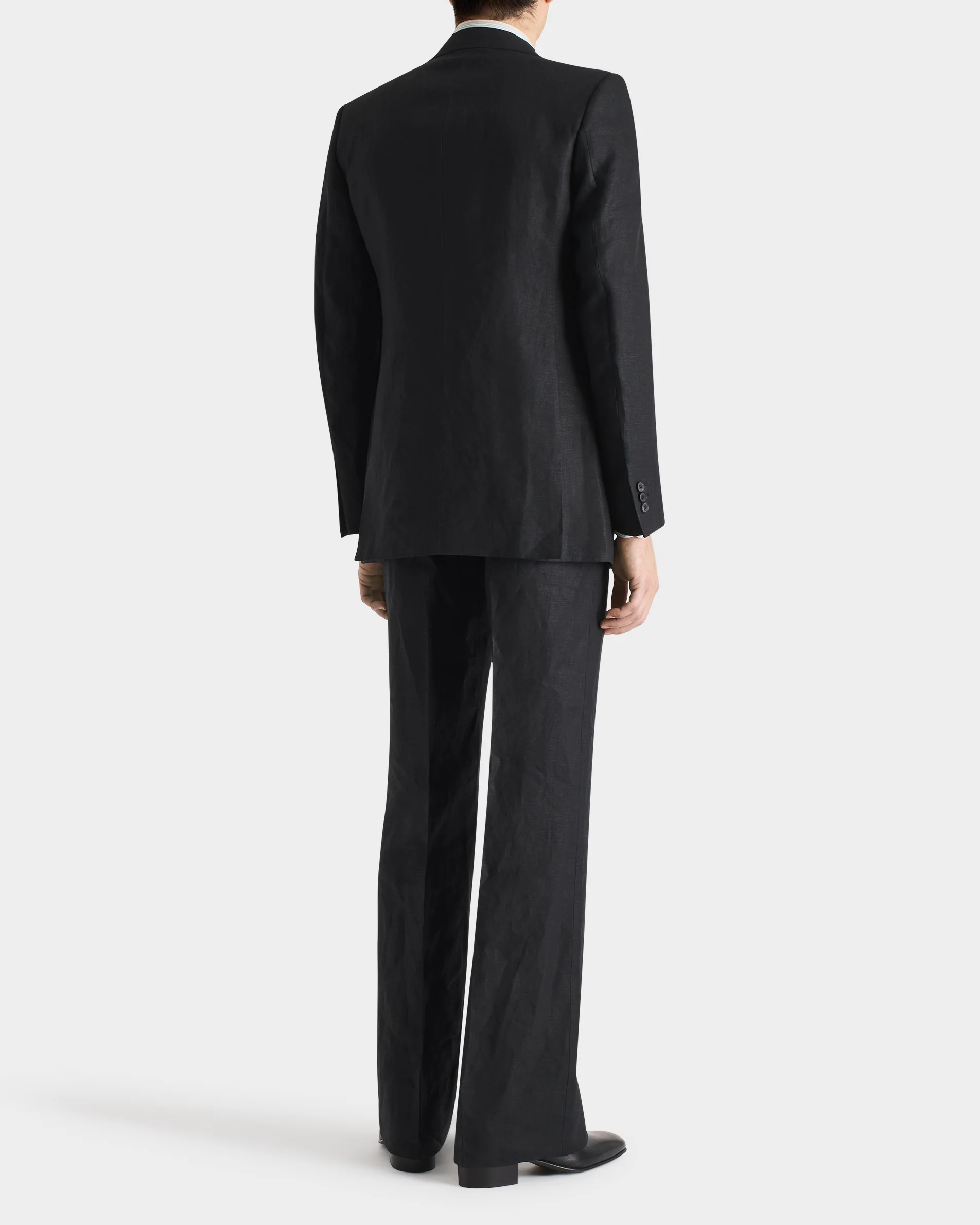 Costume droit à deux boutons, coupe classique, pantalon large, en lin irlandais.