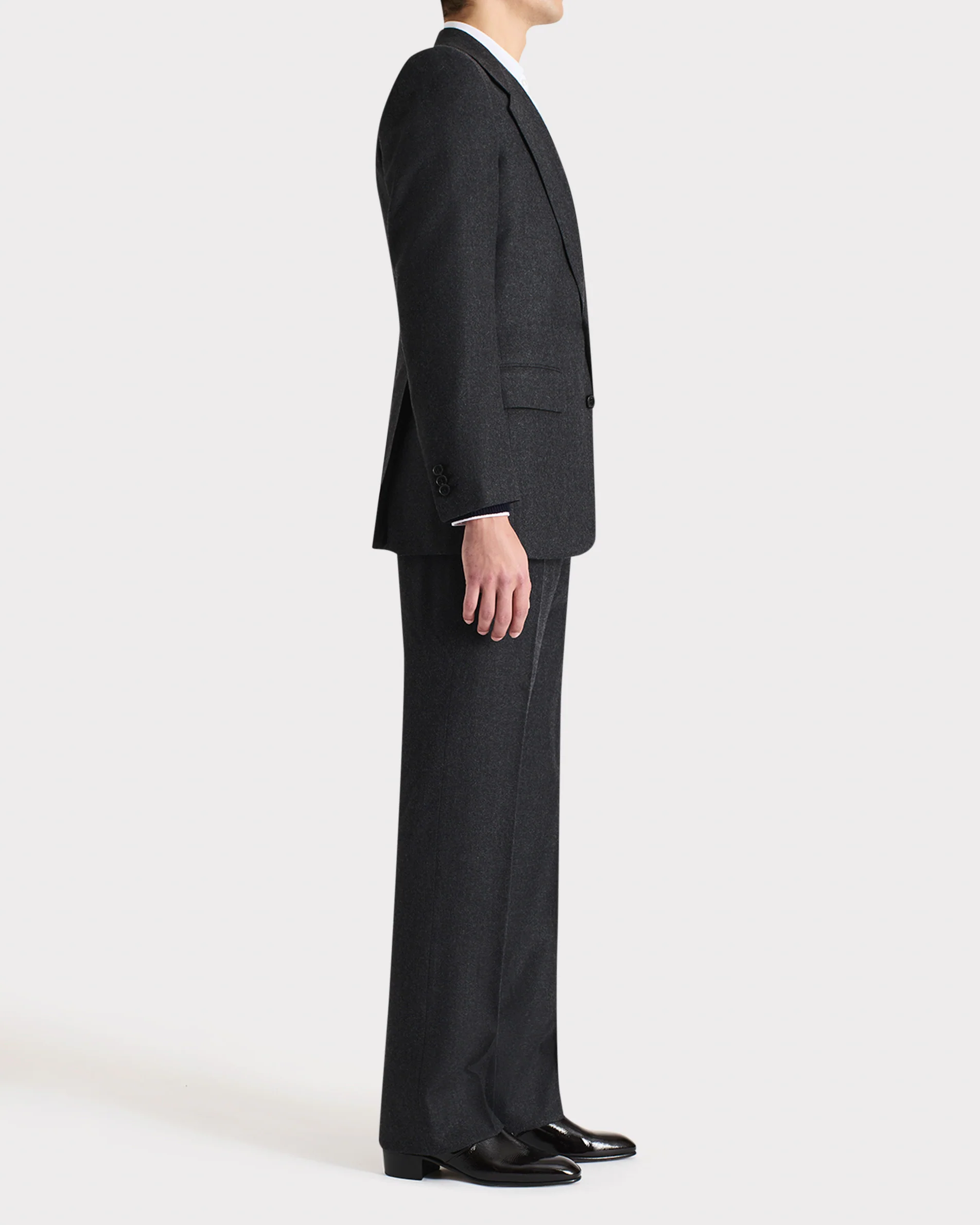 Costume droit deux boutons, coupe classique, en flanelle de laine anglaise.