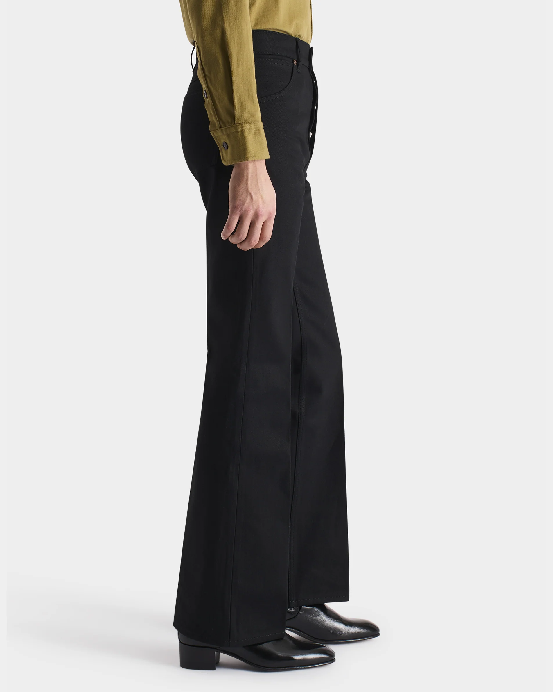 Jean taille haute, jambe évasée, en denim de coton japonais.