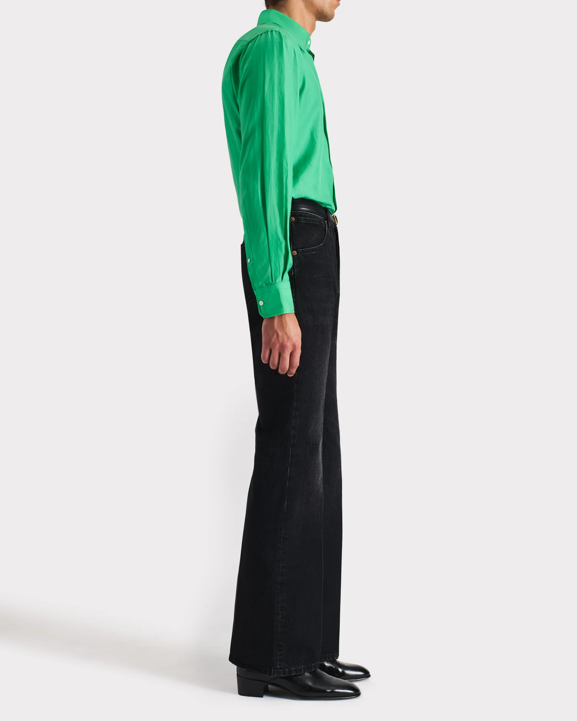 Jean taille haute, jambe évasée, en denim de coton Japonais délavé.