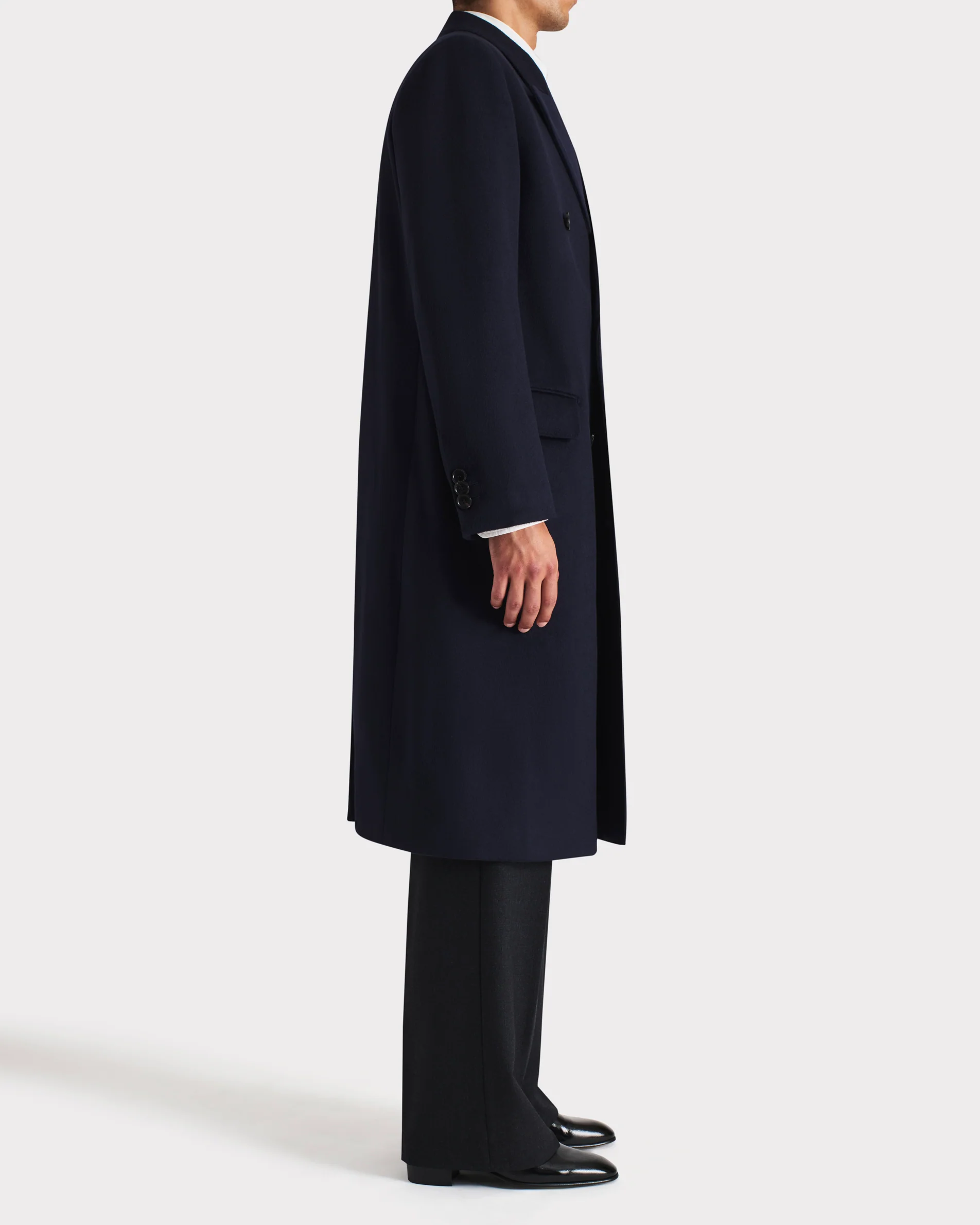 Manteau croisé six boutons, coupe évasée, en sergé de laine anglaise.
