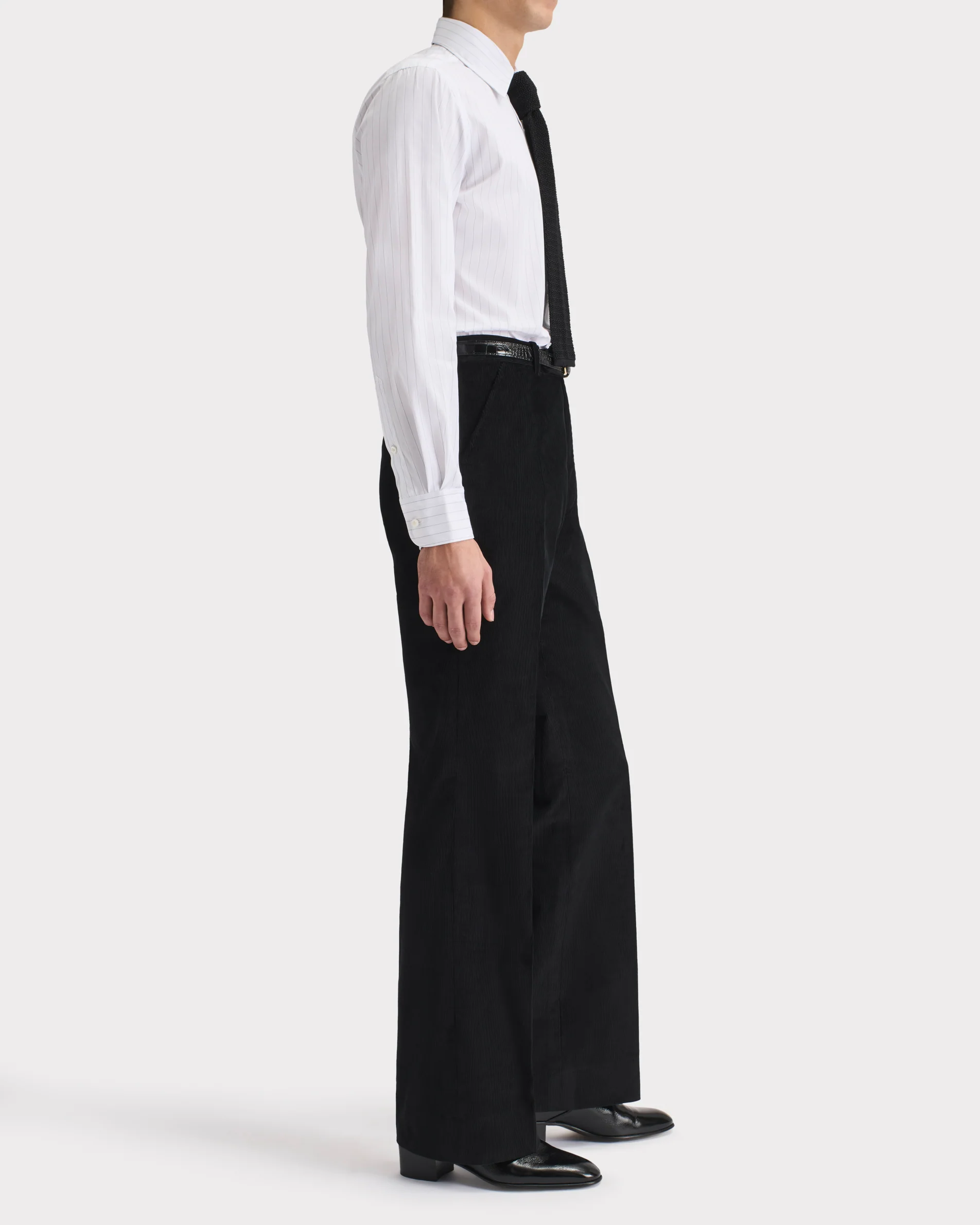 Pantalon taille haute, jambe évasée, en velours côtelé de coton italien.