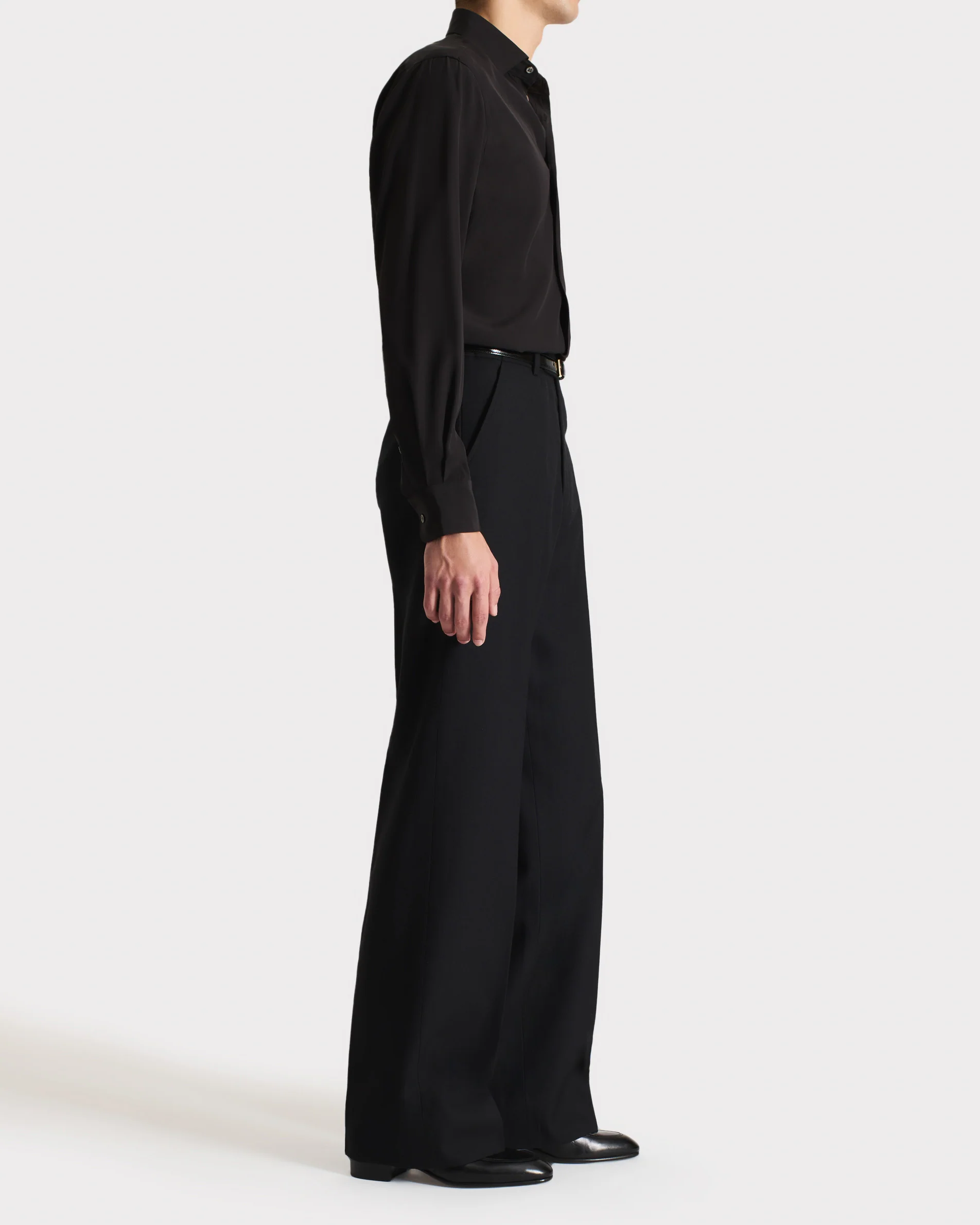Pantalon taille haute, jambe large, en sergé de laine peignée anglaise.