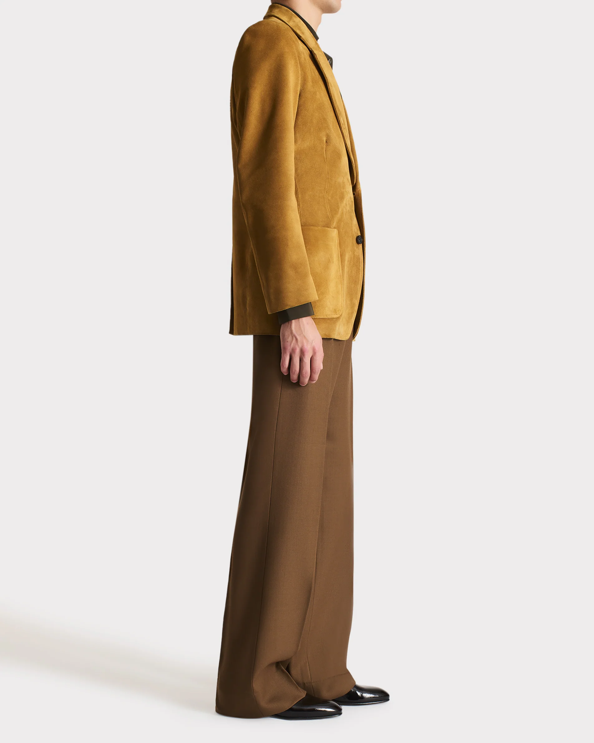 Veste droite deux boutons, coupe classique, en cuir suédé de veau français.